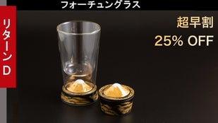 リターンDは、好評の「フォーチュングラス」ですが、今回、黄金の富士山ビアグラスとおつまみ入れのセットをご提供します。