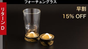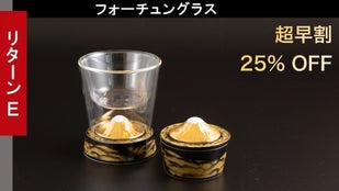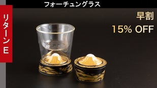 黄金の富士山が組み込まれた「フォーチュングラス」は、おつまみ入れとセットでリターンされます。ビールグラスとウィスキーのロックグラスは有田焼の台座と金色の富士山、ガラス部分はダブルウォール耐熱グラスで、商売繁盛を祈願したラグジュアリーなグラスです。