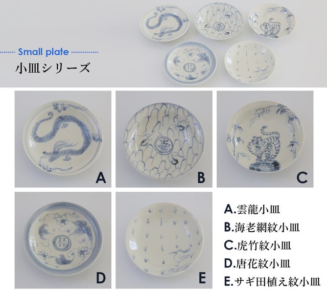 種類は、サギ田植え紋小皿、虎竹紋小皿、海老網紋小皿、雲龍小皿、唐花紋小皿の中からお選びいただけます。