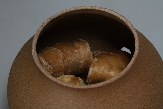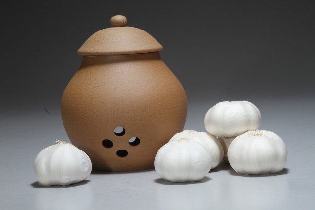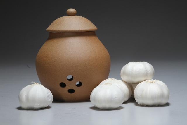 素焼きで通気性のいい陶器はガーリックポットにお勧め。にんにくは殻のまま入れ、風通しの良い日陰になる場所での保管をすれば、約1ヶ月程度、風味を逃がさずに保管できます。