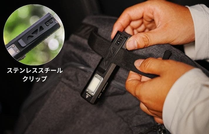 側面には着脱可能な15mm幅のステンレス製クリップを装備。バネ性は非常に優れており落下しにくく、バックパックやベルトにしっかり固定可能。