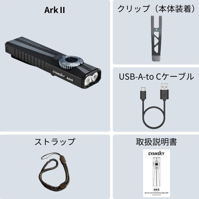 内容:ArkⅡ本体、1000mAh充電池(搭載)、USBケーブル(TypeA to C)、クリップ(本体装着)調節式ストラップ、取扱説明書