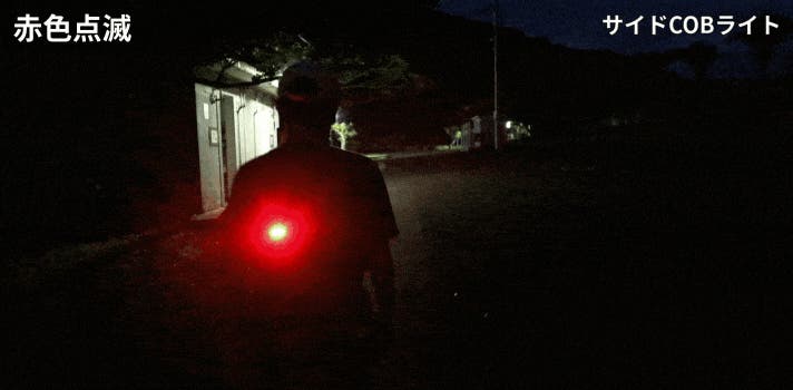 赤ライト点滅は視認性が高く自分の存在をいち早く認識してもらいやすい。遠くからでも人や物の存在を知らせるのに便利。
