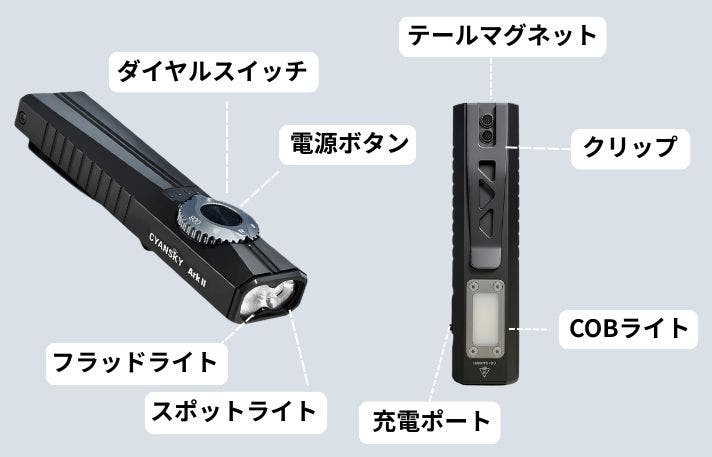 「ArkⅡ」は、スポットライト・フラッドライト・サイドCOBの3光源を搭載した多機能モデル。最大1500ルーメンの圧倒的な明るさと、17mmの薄型フラットボディ。ダイヤルスイッチで直感的に操作でき、まさに小型ライトの新基準となる1本です。