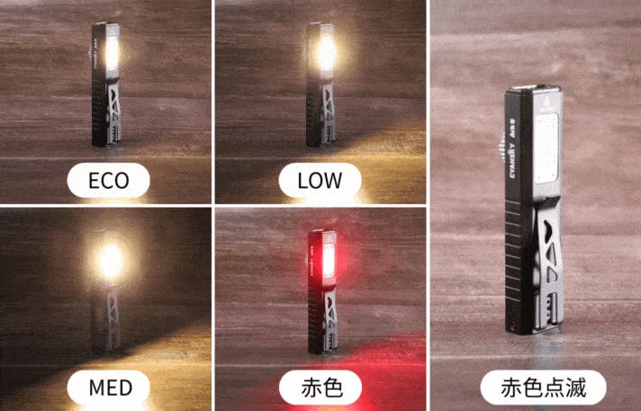 ECO → LOW → MEDの3段階の明るさ。4500Kのやわらかな光で近い距離を広く明るく照らします。キャンプやアウトドアシーンでは “ランタン灯” として、夜間作業時には “作業灯” としても使えます。長方形ボディのテールは、平らで机や地面の上に置いて自立させることができるのも嬉しいポイント。