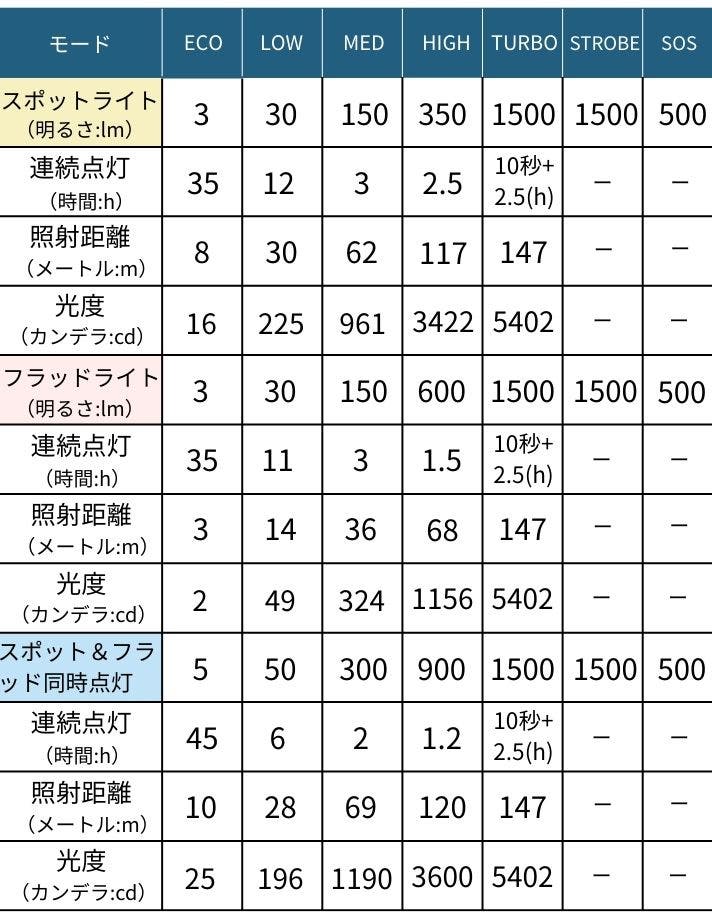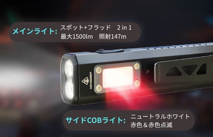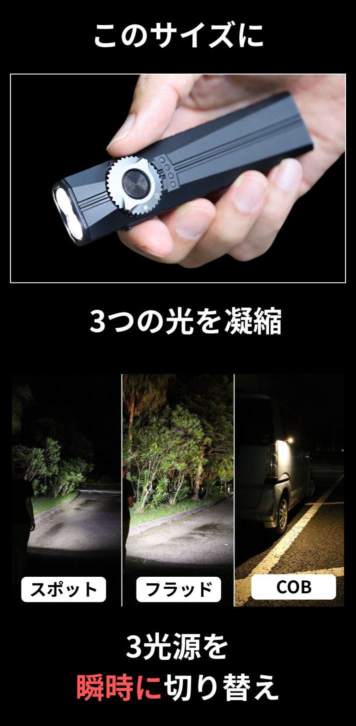- 【3光源搭載】スポット・フラッド・COBを瞬時に切替。最大1500lmで遠くも広範囲も照らす