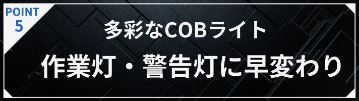 スポットライトは遠くを照らす集中光、フラッドライトは足元や広範囲を明るくする広角光。さらにサイドのCOBライトは、白色でランタンのように周囲を照らし、赤色点灯や点滅で警告灯や緊急信号としても使えます。スポットとフラッドを同時に点灯すれば、より広く明るい視界を確保できます。