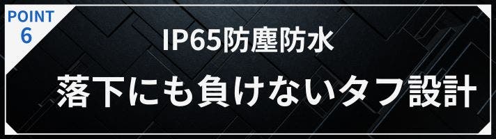 IP65相当の防水防塵設計により、水しぶきや微細なほこりからライトをしっかり守ります。