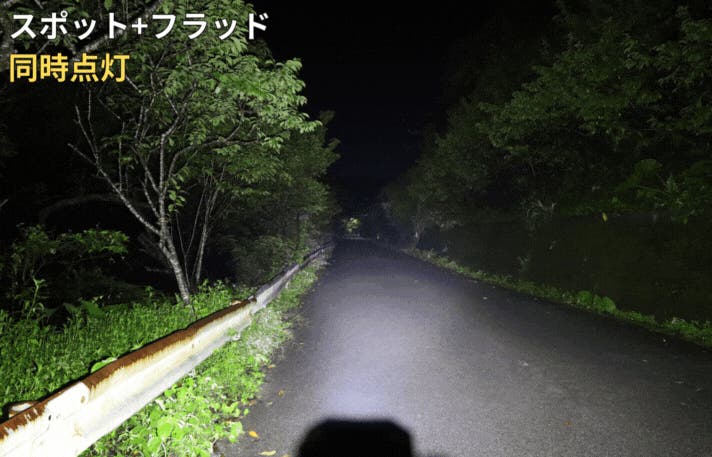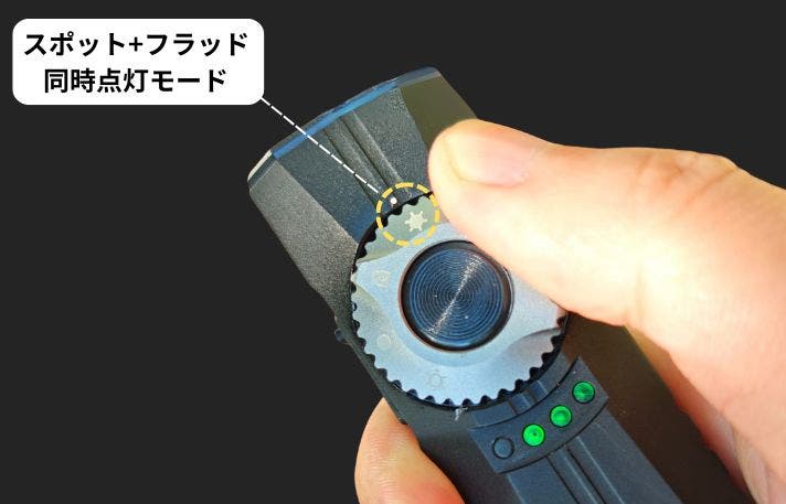 ダイヤルを合わせるだけで、スポットライトとフラッドライトを同時に点灯できます。足元から遠方までを一度に明るく照らし、夜道やキャンプで圧倒的な視認性を発揮します。
