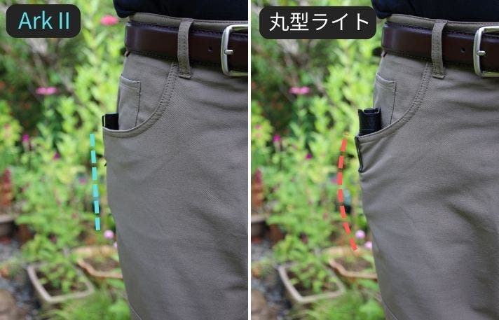一般的な丸型ライトに比べ、ArkⅡは厚さ1.7cmの薄型ボディなのでポケットに自然に収まり、動きを妨げません。