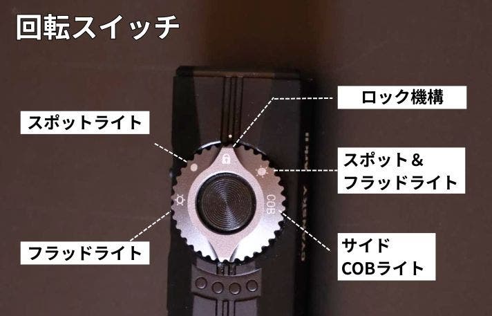 ロックを中央位置として左右それぞれ90°回転可能。『フラッド』、『スポット』、『ロック』、『スポット&フラッド(同時点灯)』、『COB』の5つのモード。