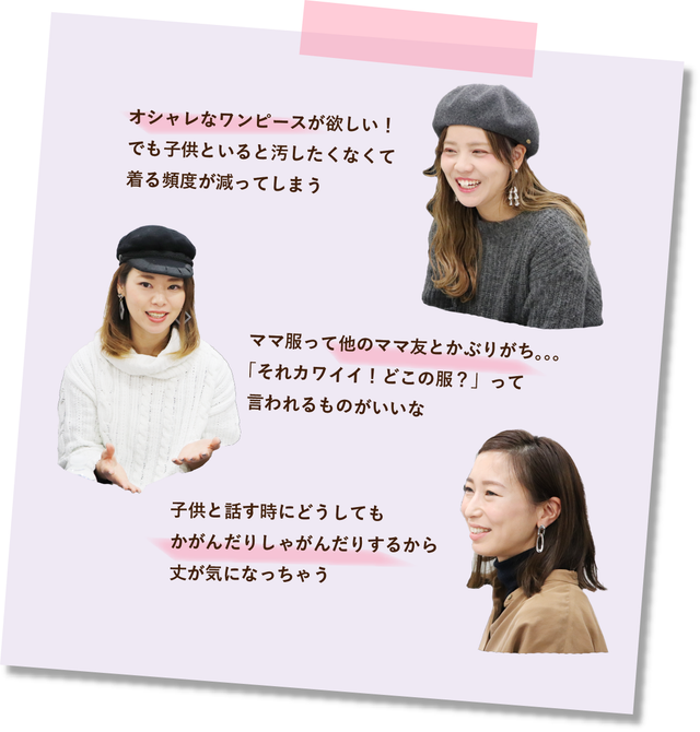 「子供と一緒だと予期せぬ動きがあったり、常に両手があいていないといけなくって洋服の立ち居振舞いまで気にしていられない!」