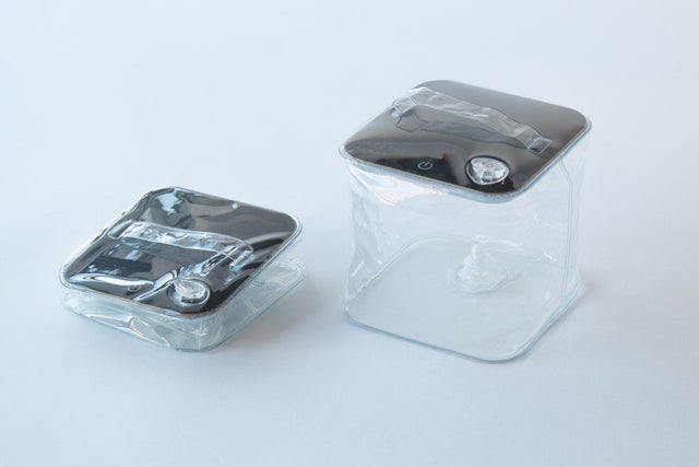 使う際にはランタンをひろげ、空気で膨らませるだけ。ビニール部が光を乱反射し、周りを明るく照らします。