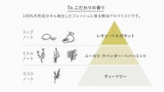 柑橘のフレッシュな甘みにはじまりラベンダー、ハーブの爽快感を味わいながら樹木の落ち着いた香りへとゆっくりと辿り着きます。