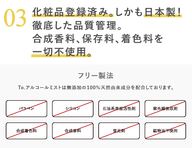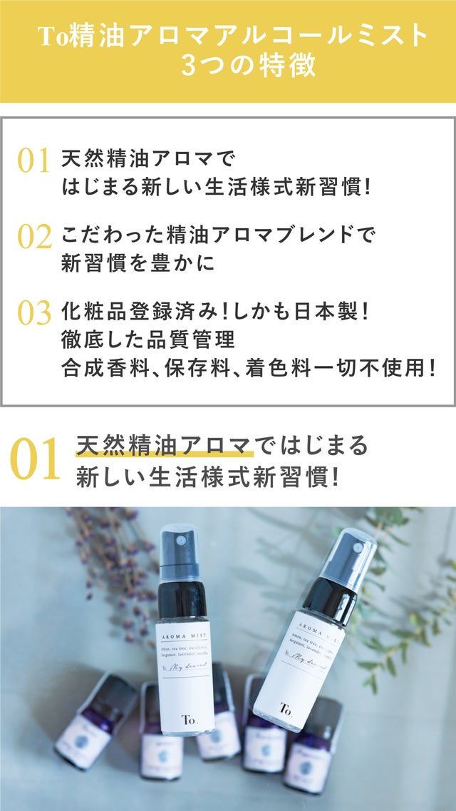 そこで、本当に必要なモノをコンセプトに今までなかった新ジャンルのアルコールを開発!「To.精油アロマアルコール75%ミスト」はアルコールを化粧品化する事で解決することに成功致しました!