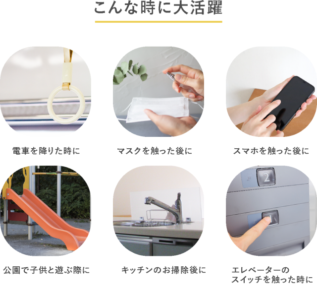 手指、マスクはもちろん、日々の生活の中でご使用頂けるよう、空間、外出時に気になるドアノブや手すりを触ったあと、など、シーンを選ばずお子様からお年よりまでお使いいただけます。精油アロマの香りではじまる、新習慣!