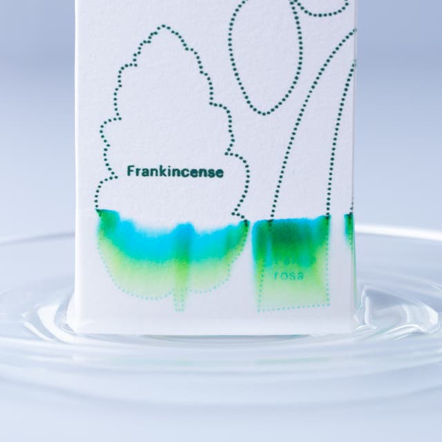 クロマトグラフィーとは、色素の親水性の違いによって、インクの色が分離する現象のことです。この現象を活用することで、嗅覚だけでなく視覚的にも楽しめる、全く新しいアロマができました!