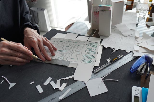 パッケージ全体の変化を楽しむためには、上部まで溶剤を吸わせることが必要不可欠です。様々な紙種と、底面の構造のテストを行い、吸い上げが最も良くなる組み合わせを見つけ出しました。