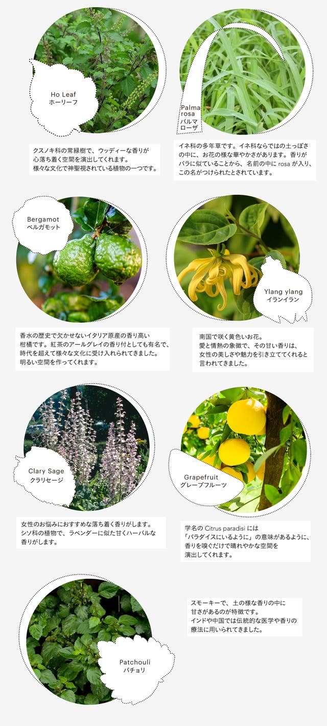 植物から抽出された天然精油は、濃縮された香りのエッセンスです。その中には、様々な芳香成分が、ぎゅっと詰まっています。思わず深呼吸したくなるような、フレッシュな香りがあなたを包み込みます。