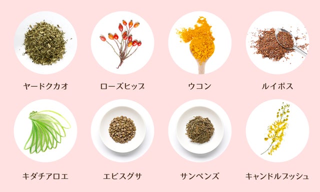 ルイボス、エビスグサの種、ウコン、キダチアロエ、サンペンズ、茶抽出物/香料