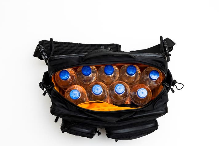 ペットボトルにゴム紐をかけるとバッグが斜めになってもボトルが安定します。