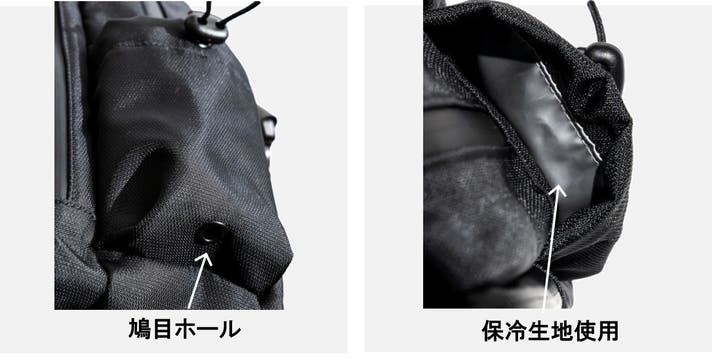 バッグの両サイトにはペットボトルや折りたたみ傘が入るボトルホルダーがあります。ポケットには荷物を押さえる調整ゴムと水気を放出する鳩目ホールをつけました。裏側には保冷生地をしております。