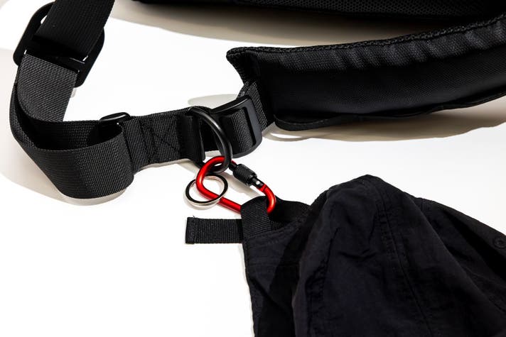 ショルダーベルトにはスライド調整バックルとは別にもうひとつDカンを付けています 。クロスストラップを掛けるだけではなく、お好みに合わせてカラビナを掛けたり 帽子を掛けたりもできます。