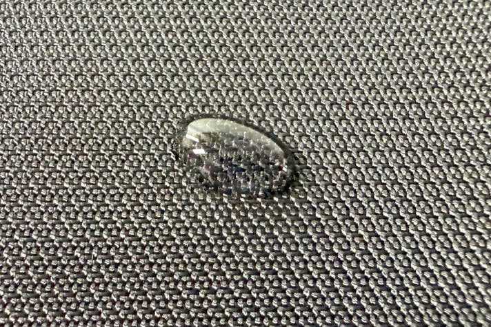 少し光沢がある素材で型崩れしにくく、紫外線にも比較的に強く色落ちがしにくい 素材です。 また撥水加工を施していますので、雨や汚れをしっかりガードします。 完全防水ではございませんので強い雨や長時間の濡れには 浸水する可能性があります。濡れた場合は軽くふき取ってください。