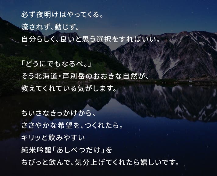 私たちは、ただ「美しいデザイン」を作るだけでなく、芦別の自然、美、文化を感じ、人々の心に灯をともすようなブランドを育てていきたいと思っています。このマークを通して、芦別岳の峰々と星空を背景に、皆さまが「自分の一番星」を見つけ、前へと進むきっかけになればと願っています。