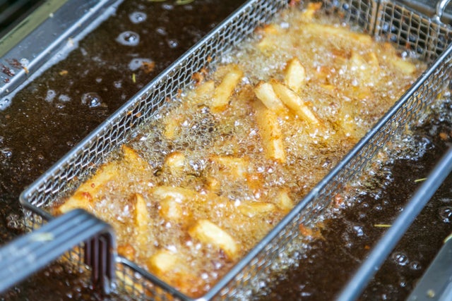 「冷凍のハンドカットフライズを170~180℃の油で揚げるだけ。」