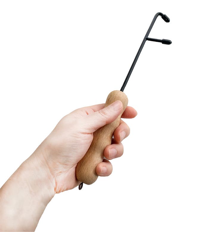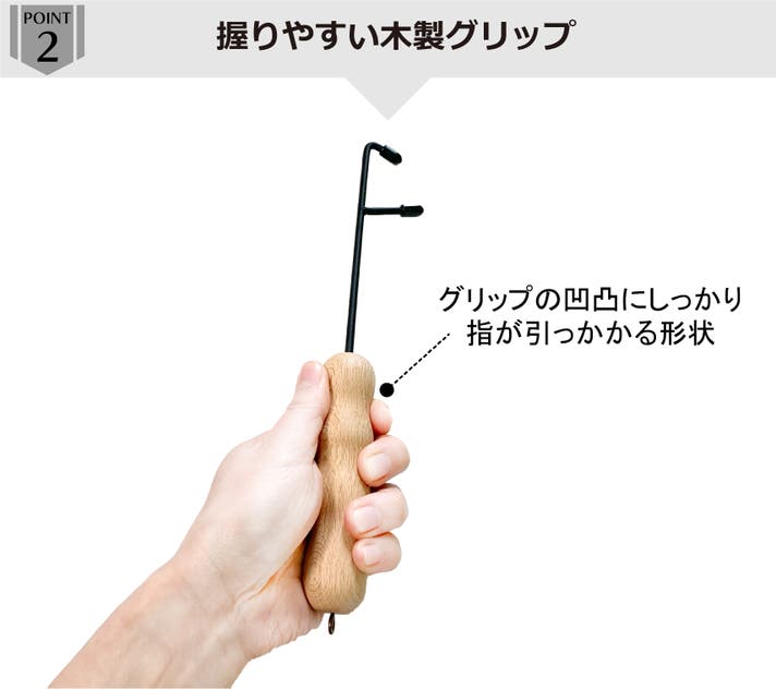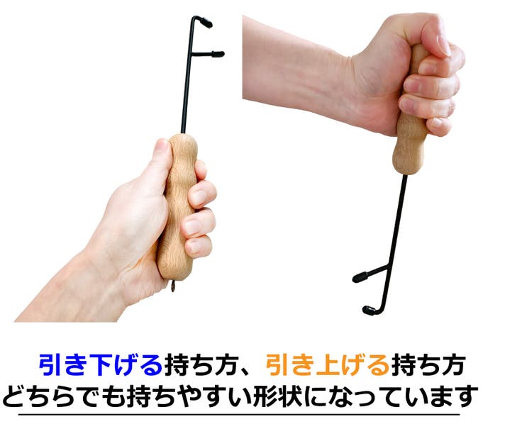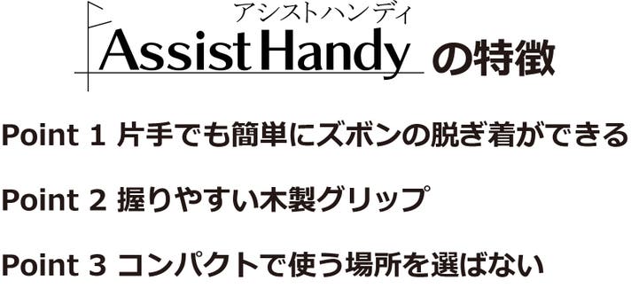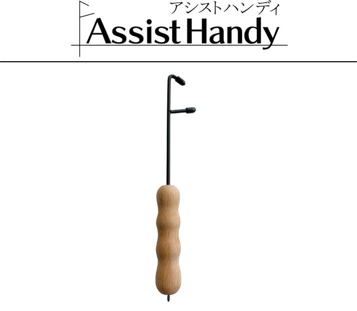 アシストハンディは、手が不自由な方や半身麻痺の方が、他の人のサポートなしでズボン類の上げ下げをスムーズに行えるように設計された補助具です。 コンパクトな形状とフックの角度にこだわり、少ない動作で衣服を上げ下げできるように工夫されています。 さらに、木製グリップは握りやすい形状に設計されており、手先に力が入りにくい方でも扱いやすい仕様です。