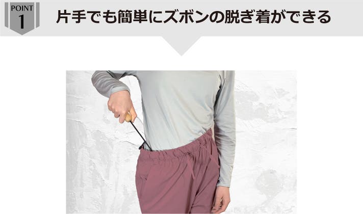 - ズボンなどの上げ下げの他にも靴下の脱着や物を引き寄せるなどにも便利です。