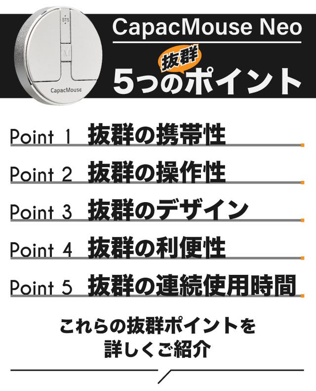 こんなに小さくても抜群の操作性を誇ります。特に最新モデルであるキャパックマウスNEOは、メーカーの技術を総動員することによって大きな進化を遂げています。
