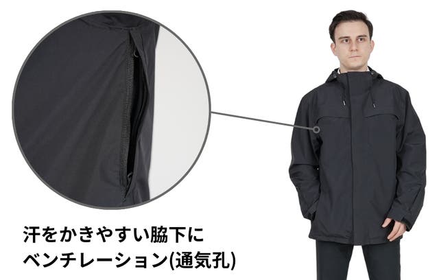 脇の下にベンチレーション(通気孔)も実装しているため、電車など急に暑くなった場合も快適に過ごせます。