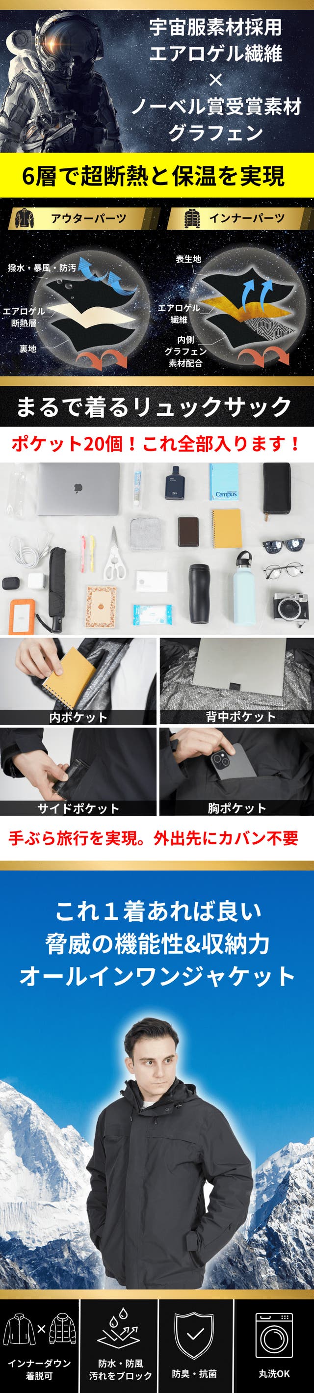 - 宇宙服素材エアロゲル×ノーベル賞素材グラフェンを採用!6層で超断熱と保温を実現!