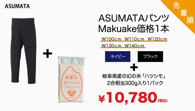 ASUMATAパンツ (ネイビー/ブラック)1本と、感謝米1袋(岐阜の希少米ハツシモ/2合相当300g入り)のセット価格