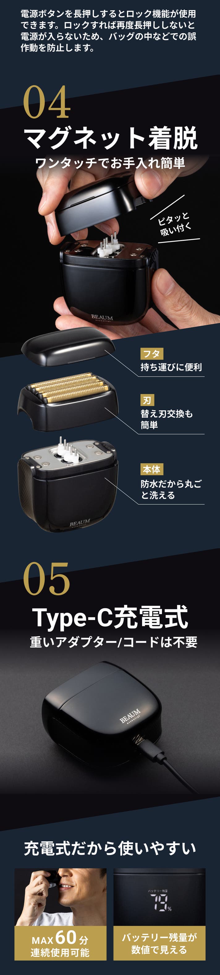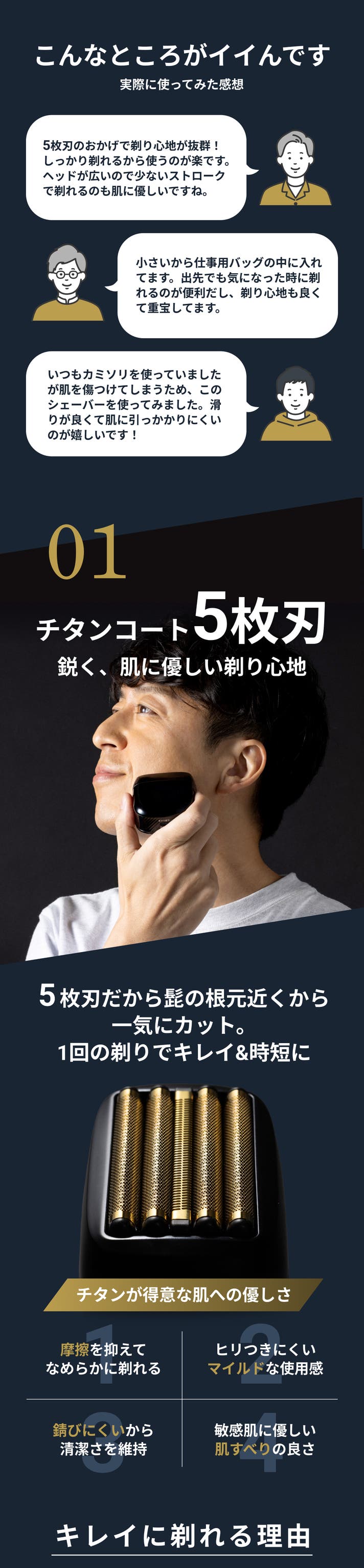 - 肌へのやさしさと剃り味を両立したチタンヘッド搭載。独立して動く5枚の刃が肌にピッタリフィット。