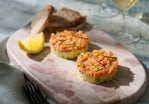 約1センチ角にカットしたアボカドのマヨネーズ和えにサーモンのタルタルを載せ、チャイブやレモンを添えて。セルクルなどで成形してよりおしゃれに!(●使用商品:富士の介サーモンのタルタル)