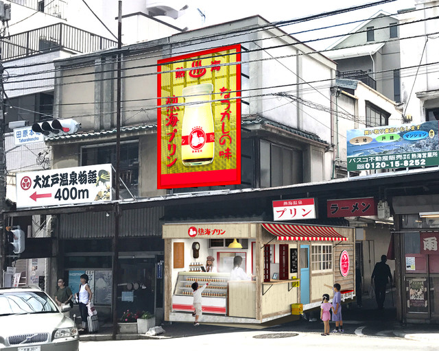 すばらしい熱海の街並みにとけこむ様に懐かしさを感じるデザインを選びました。 牛乳瓶のカタチのプリン熱海の街並みにぴったり馴染む! あの頃の熱海。熱海の魅力を次の世代にちゃんとバトンタッチすることが私たちの想いです。
