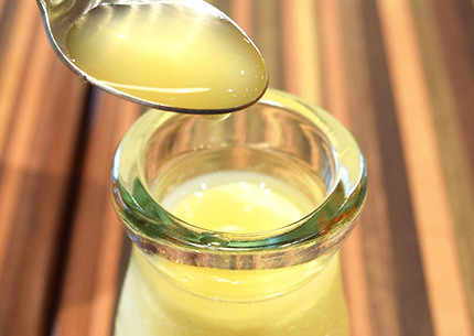 次に、「だいだいシロップ」をかけて“きゅん”と甘酸っぱいシロップがたまりません!最後に、「千年井田塩」をパラパラと。キリッとした味わいをご堪能ください。