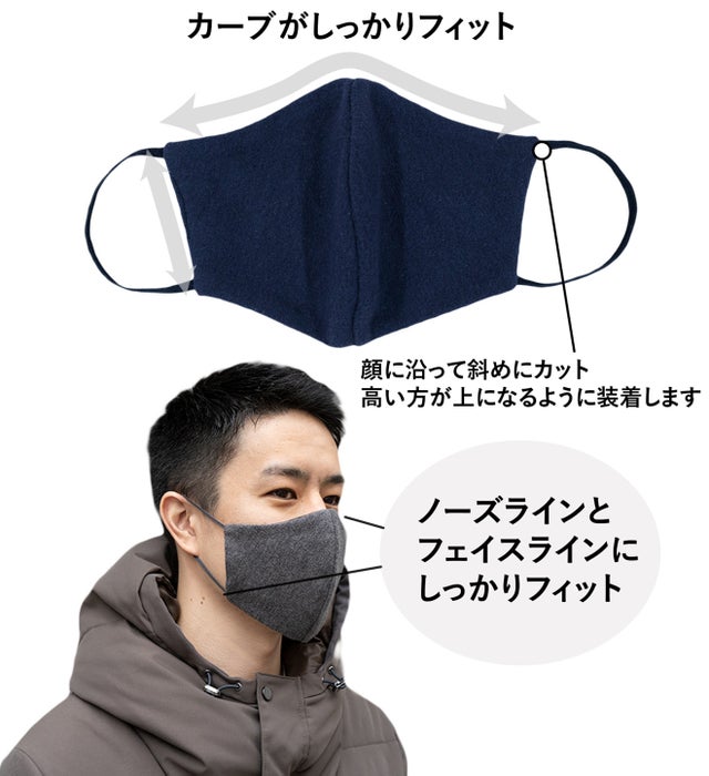 最終加工で表地に起毛をかけていることで、さらにタッチが柔らかく優しい着け心地が実感できます。起毛効果で暖かさも増し冬に手放せないマスクに仕上げました。
