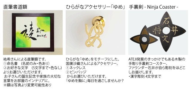 このプロジェクトをご支援いただいた方へのリターンとして、プロの書道家によるあなたのためだけのスマートフォン壁紙や、色紙・名刺・名前シールなどのグッズ、また、MAKUAKEコラボ企画として、話題の「ひらがなアクセサリー」の商品もご用意させていただいています。ぺージ下部にありますので、ぜひ選んでみてください!
