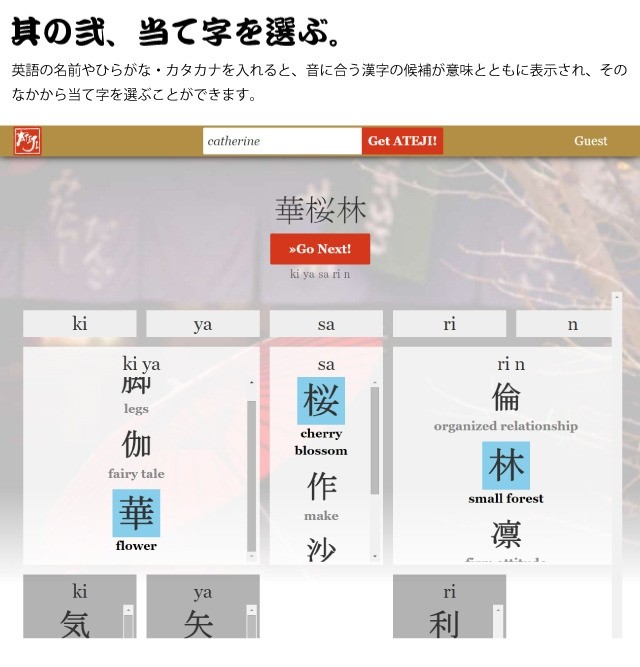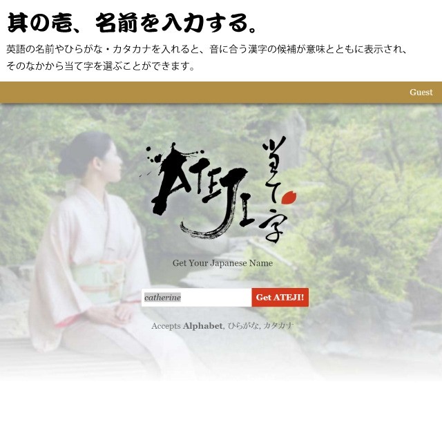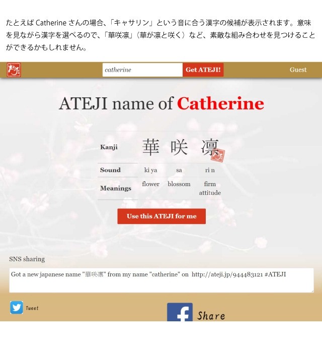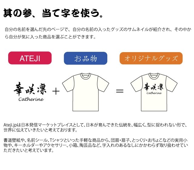 ATEJI(http://ateji.jp)は、海外の方が「当て字」を気軽に楽しめるWebサイトです。当て字例)Catherine(キャサリン)→華咲凛