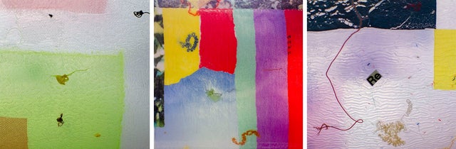 透明なオレフィン樹脂素材に、オーガンジーのはぎれ、糸くず、レジ袋の1部分、都市の片隅に咲く草花――といった端材をコラージュのように散りばめ、洋服の芯地を固定するときなどに使うプレス機で熱を加えて圧着します。