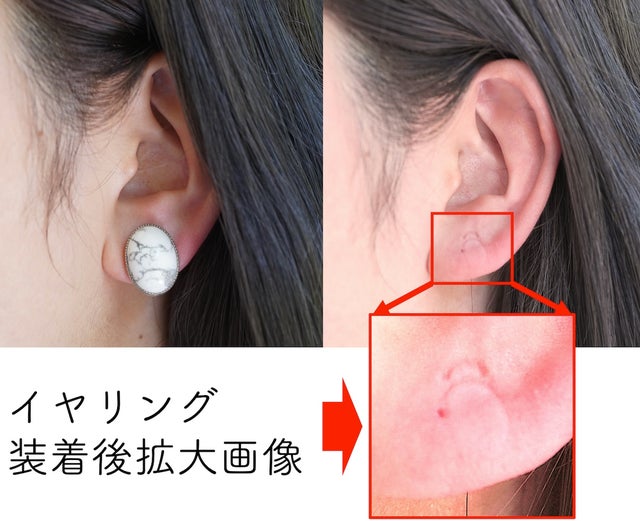 イヤリング装着後の画像です。赤い痕が痛々しいです。