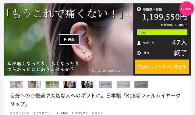 「Makuake(マクアケ)」は、実行者の想いを応援購入によって実現するアタラシイものやサービスのプラットフォームです。このページは、 ファッションカテゴリの 「耳に穴を開けたくない方に着けて欲しい!ピアスにも見える、イヤークリップ第2弾!」プロジェクト詳細ページです。