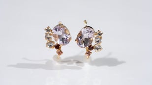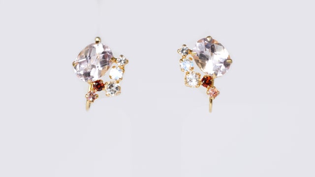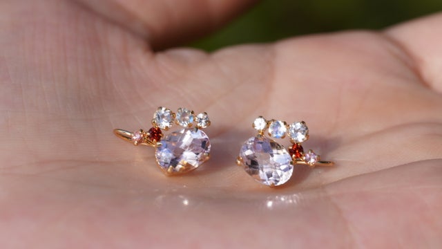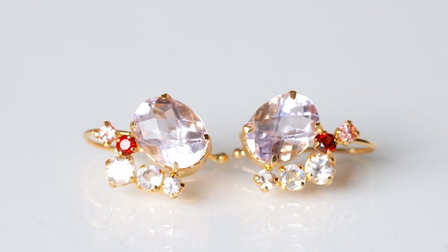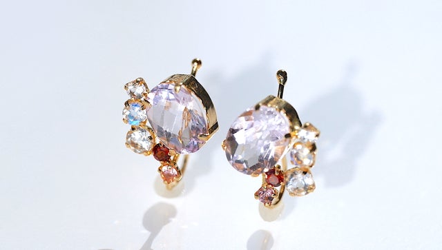 透明感を重視した薄紫色の大粒アメジストとホワイトトパーズ、ブルームーンストーン、ガーネット、ピンクトルマリンと贅沢に天然石を使用したピアスに見えるイヤークリップです。