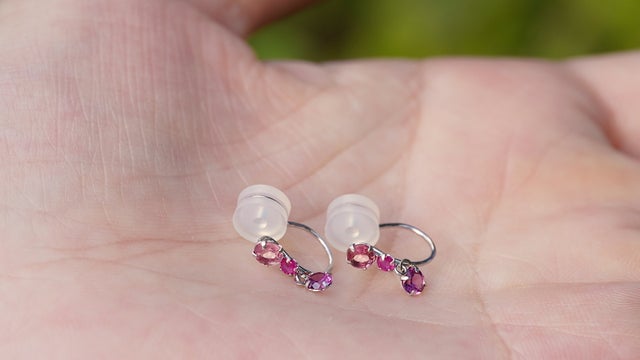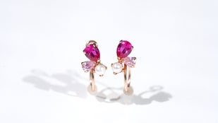 ピンクや紫色の天然石でまとめたイヤークリップです。