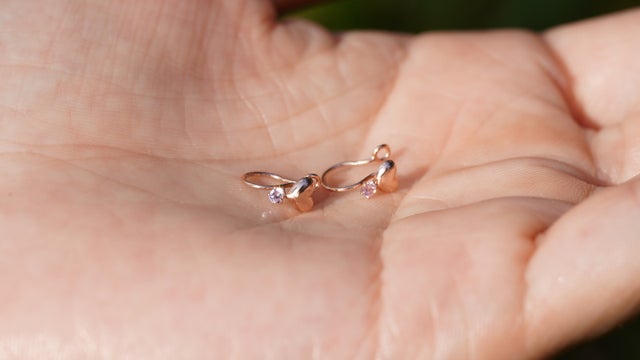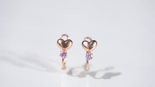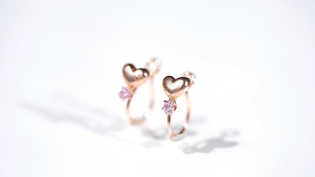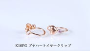 ハート型にかたどったK10PG素材に、薄紫色のキュービックジルコニアを着けて、気軽に楽しめるようにしています。