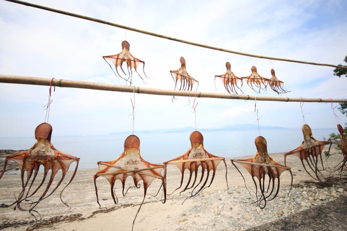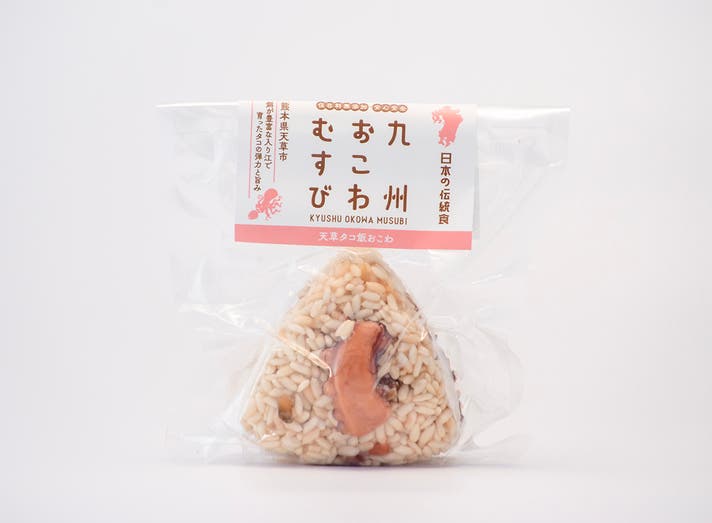 天草地域では弾力があって歯応えのいいマダコが一年中よくとれます。特にタコが多くとれる夏には、足を広げて吊るされた潮風に揺れる「干しダコ」を、街道沿いに多く見ることができ、地域ならではの風物詩としても知られています。甘みが強く旨みが凝縮されている天草のタコを使い、天草で生まれた地域の伝統食でもある「タコ飯」をおこわにしました。